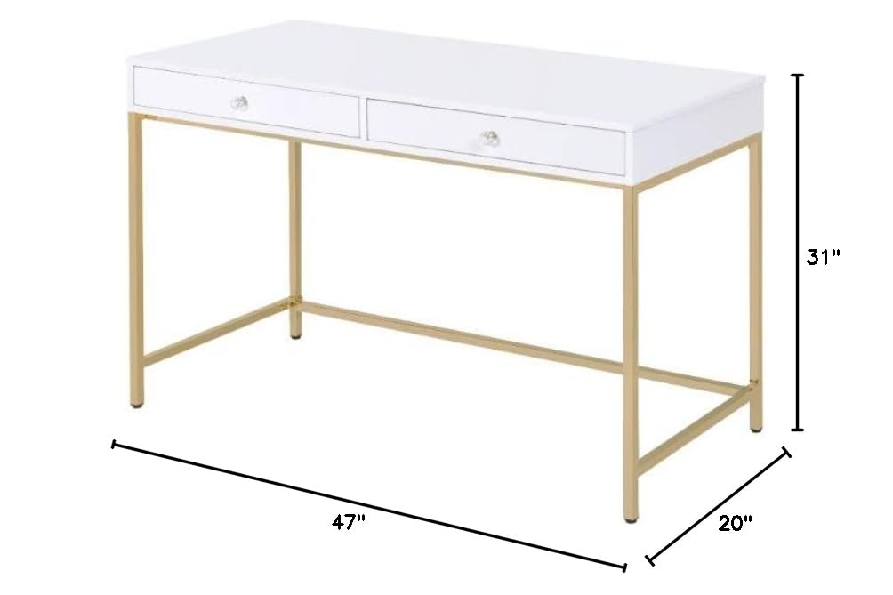 Acme Ottey Wooden Top Writing Desk with 2 Drawers in White High Gloss and Gold—